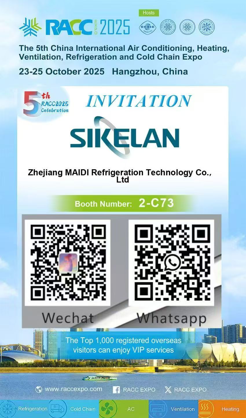 2025年10月23-25参展杭州第5届国际空调通风制冷及冷链产业展览会 SIKELAN 展位号:2-C73 欢迎各位新老客户莅临参观指导!